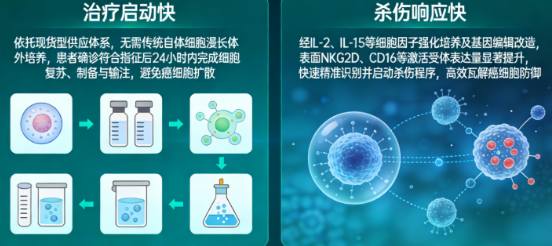 加强型NK细胞的即时性优势,主要集中在“治疗启动快”和“杀伤响应快”两大核心层面,为肿瘤患者争取宝贵的治疗时间: