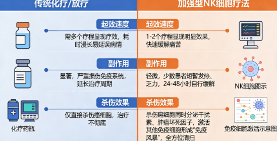 相较于传统化疗、放疗,加强型NK细胞疗法的即时性优势尤为突出,两者的核心差异主要体现在以下三点: