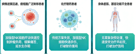 加强型NK细胞的即时性优势,在晚期肿瘤治疗中尤为关键,为各类困境中的晚期患者提供了新的治疗选择:晚期肿瘤患者病情进展迅速、癌细胞广泛转移,急需快速有效的治疗手段控制肿瘤负荷、缓解痛苦、延长生存期;对于化疗耐药患者,传统治疗方案已失效,加强型NK细胞疗法可快速发挥杀伤作用,打破耐药僵局,为患者争取新的生机;对于身体虚弱、器官功能不全、无法耐受手术和放化疗的患者,该疗法无需复杂的预处理流程,可快速接受治疗并起效,彻底打破治疗困局。