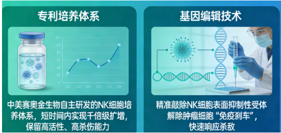 一是专利培养体系。中美赛奥金生物自主研发的NK细胞培养体系,可在短时间内实现NK细胞的千倍级扩增,同时最大限度保留细胞的高活性、高杀伤能力,为即时治疗提供充足且优质的“战力储备”;